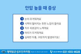 안압이 높을 때 증상은 초기엔 자각하기 어렵지만, 시야 흐림, 두통, 눈 통증, 무지개빛 후광이 보이면 안압 상승을 의심해야 합니다. 특히 급성 증상은 시력을 잃을 수 있으니 신속히 병원에 내원하세요. 정기적인 안과검진과 건강한 생활습관으로 녹내장 등 합병증을 예방하는 것이 중요합니다!