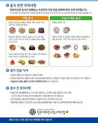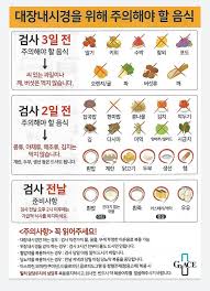 | 검사 3일 전 | 흰쌀, 백미밥, 흰빵, 감자(껍질제거), 계란, 생선, 닭, 두부 | 현미, 잡곡, 나물, 콩, 김치, 해조류, 씨 있는 과일 |