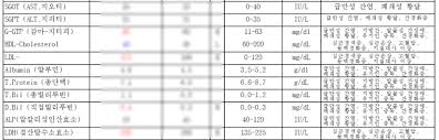 - ALT 7–55, AST 8–48, ALP 40–129, GGT 남 8–61/여 5–36 U/L